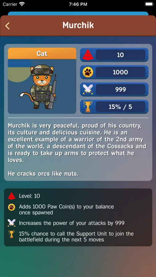 The fantastic inhabitants of Fluffy Land are cats and dogs. Combine 20 unique characters with 2 development branches to defend yourself against the nasty orcs! Among them are representatives of the top 10 armies of our time, including the United States, Ukraine, China, France and others. Many of them can be used as support units.