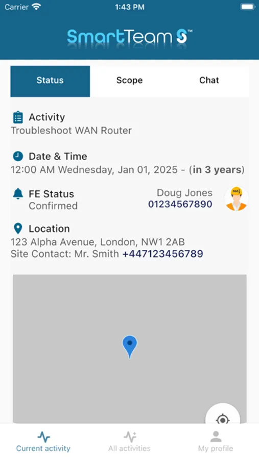 - Map tracking - enables all observers of the activity to see exactly when the field engineer is due on-site, allowing everyone involved to plan the activity start with confidence