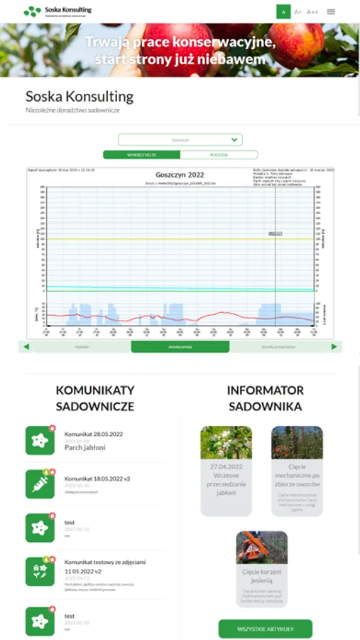 Soska konsulting to niezależne doradztwo sadownicze w zakresie uprawy jabłoni i grusz. Celem doradztwa jest dostarczenie sadownikom dodatkowej dawki wiedzy na temat produkcji jabłek i gruszek. Może ona posłużyć do pogłębienia wiedzy, a także być inspiracją do działań w gospodarstwie. Podstawową usługą dla sadowników w zakresie skutecznej ochrony roślin są komunikaty sadownicze. Powstają one w oparciu o dane ze stacji meteorologicznych, monitoringu szkodników i obserwacji w terenie. Na podstawie zebranych danych dotyczących chorób i szkodników, przetworzonych następnie za pomocą modeli matematycznych powstają komunikaty dla sadowników, z propozycją sposobu ochrony. Komunikaty są wysyłane różnymi kanałami (do wyboru przez klienta): w formie skróconej (jako SMS lub powiadomienie ‘push’) oraz pełnej (przez stronę internetową i aplikację mobilną).