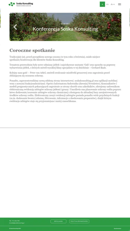 Firma Soska konsulting stale się rozwija, wykorzystując własne doświadczenie oraz wiedzę z całego świata dotyczącą produkcji wysokiej jakości jabłek i gruszek, aby sprostać rosnącym wymaganiom światowych rynków owocowych. Prowadzi własne doświadczenia polowe i nie boi się sięgać po najnowsze rozwiązania technologiczne, które pomagają polskim sadownikom usprawnić produkcję wysokiej jakości owoców i poprawić jej wynik ekonomiczny.
