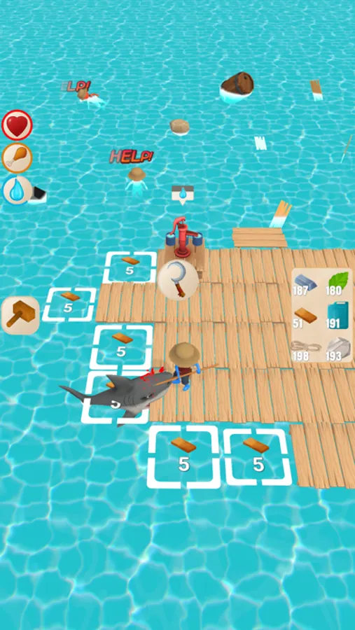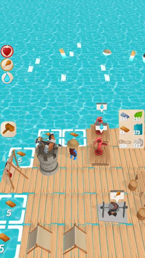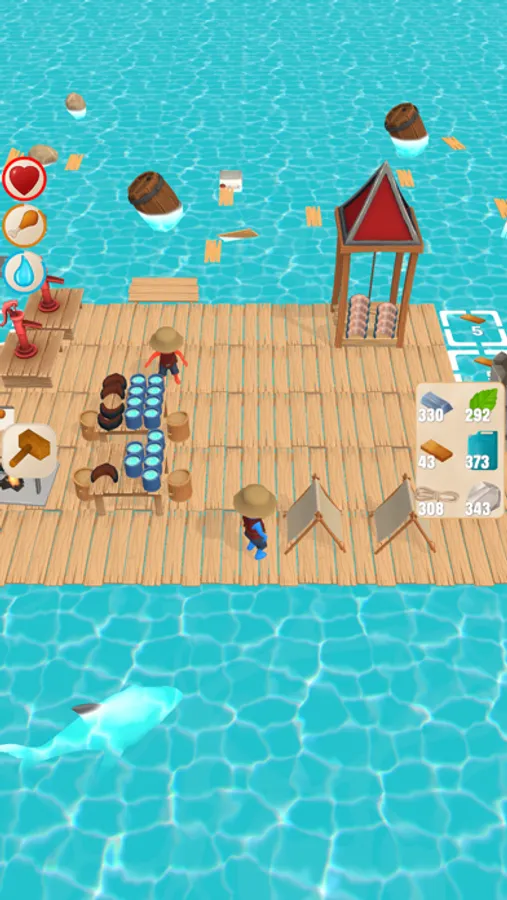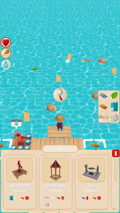 Collect resources with your hook and craft buildings. Try to survive on your raft!