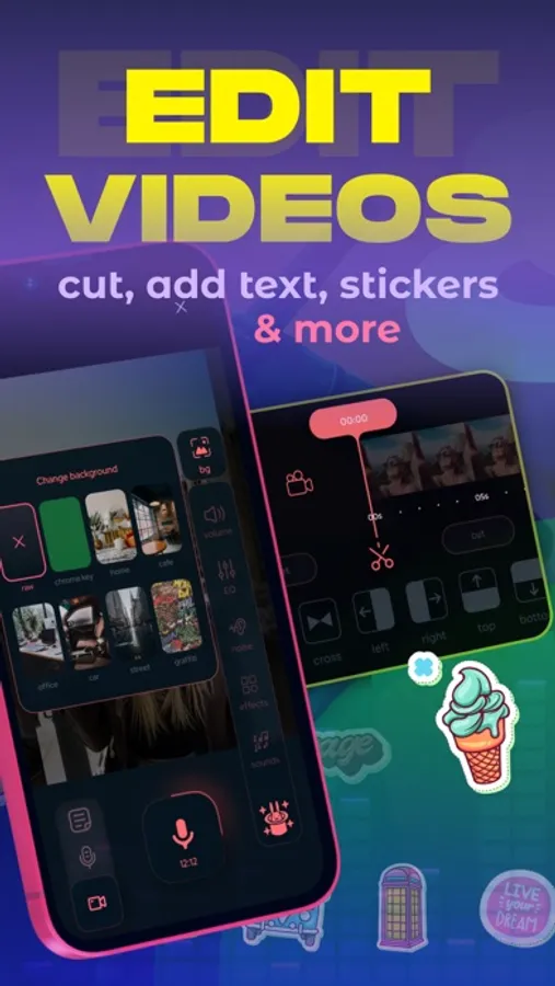 ■ Edit Videos: Cut your clips, add effects, and change the background to create the perfect video.