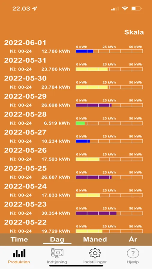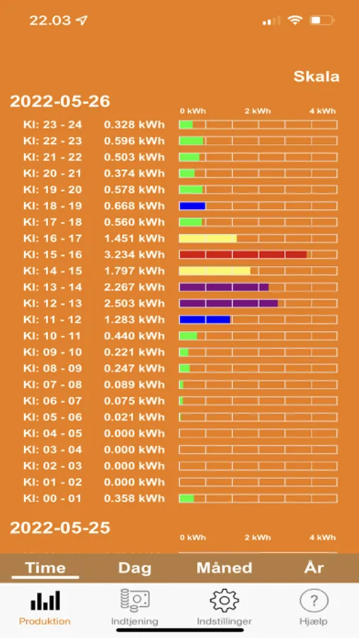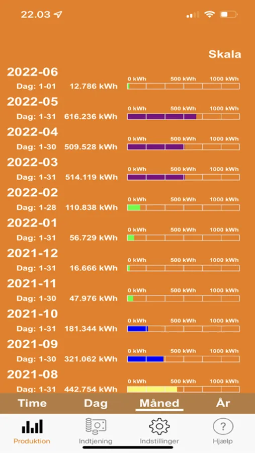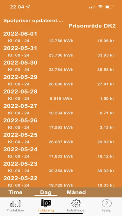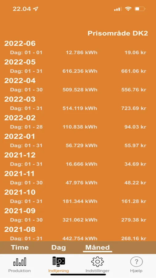 Du kan du se din produktion i kWh og indtjening i kr per dag, måned eller år op til 4 år tilbage i tiden.