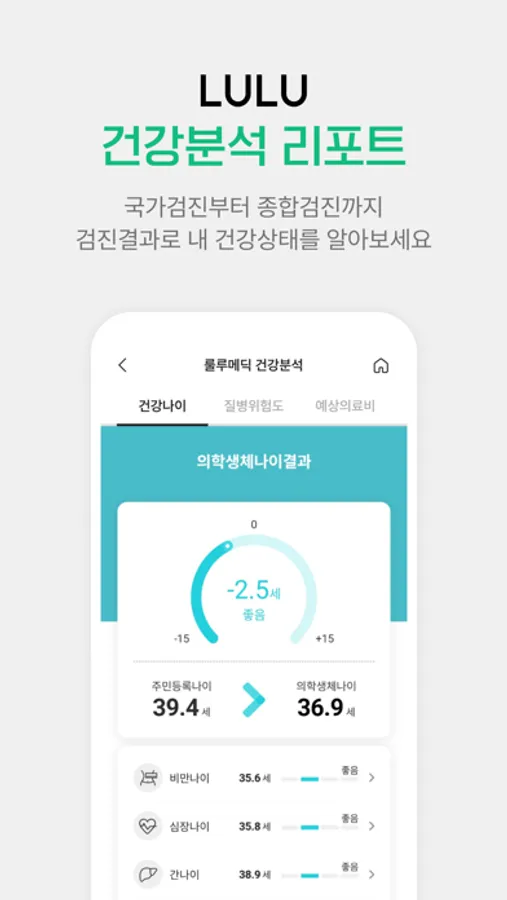 - 건강 나이, 질병위험도, 예상의료비 등을 예측하여 더욱 건강한 나를 위한 개선 방안을 제안합니다.