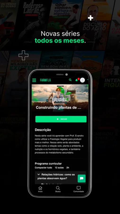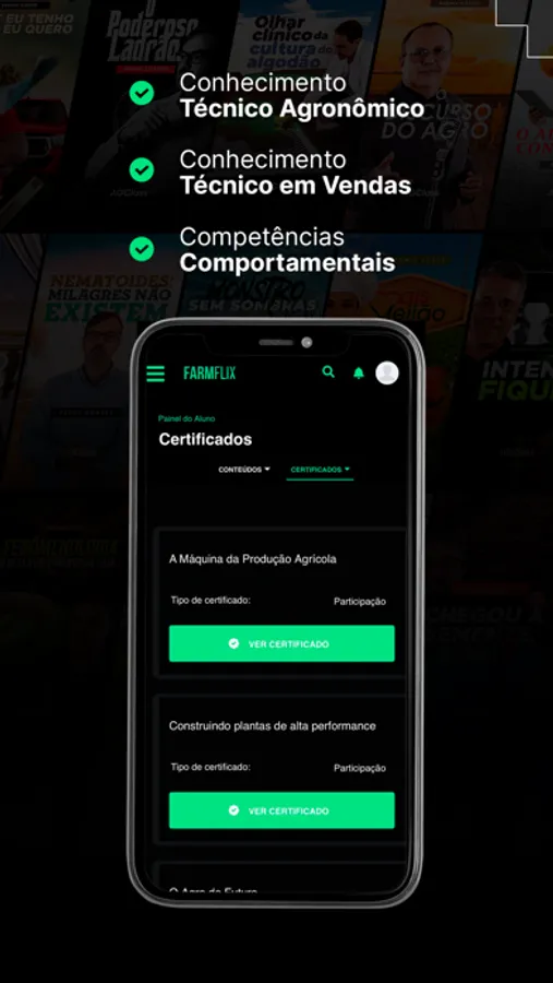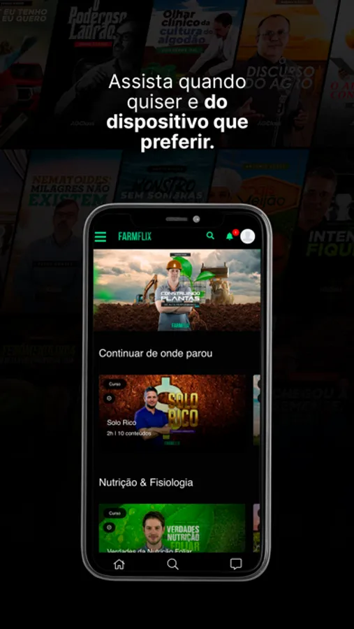Na FarmFlix você tem acesso aos conteúdos agronômicos, comercial, marketing e Soft Skills de maneira ilimitada. Comece agora mesmo seus estudos com os melhores especialistas em um único local, e seja o responsável da sua melhor versão.