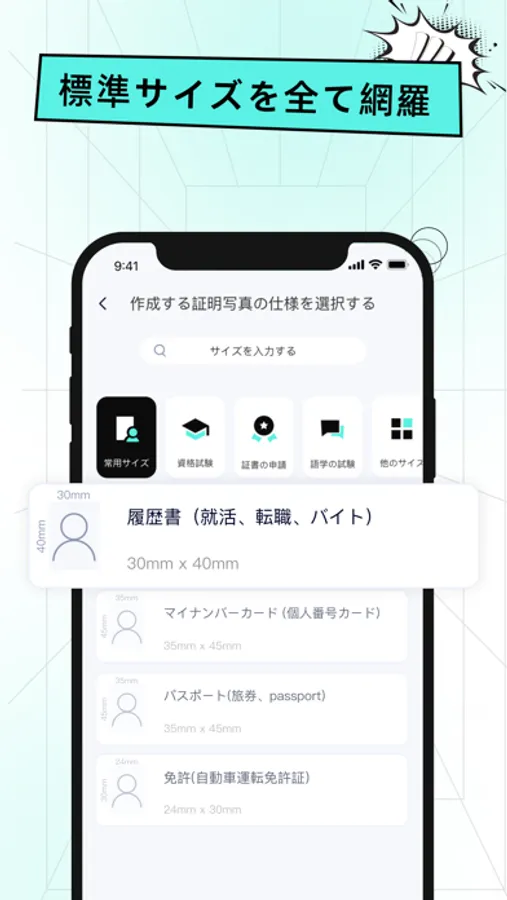 必要な証明写真サイズが見つかりませんか?? 「AI証明写真」は数百種類の証明写真のサイズを提供する。以下は、アプリケーション内の一部のしょうめいしゃしんサイズの例である。