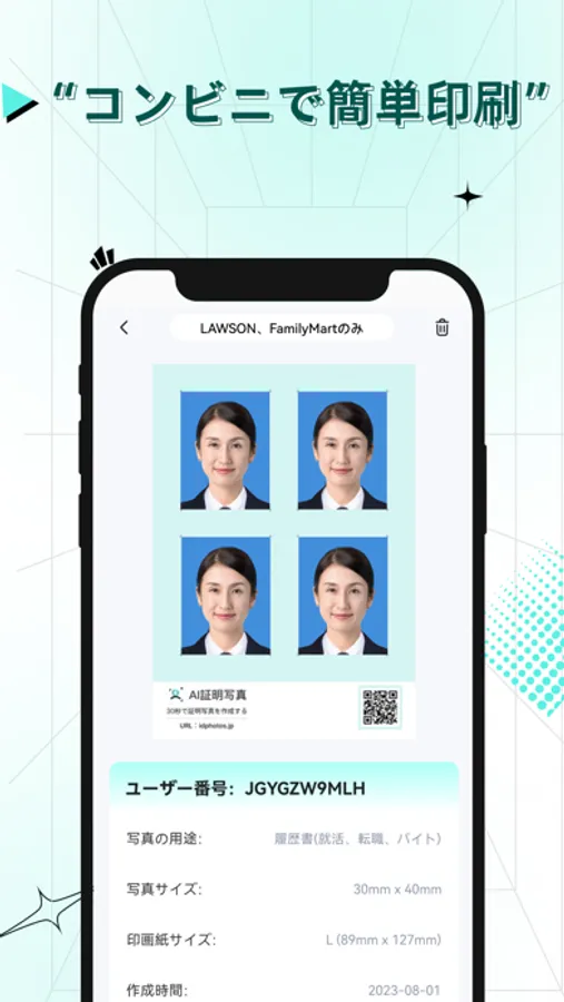 印刷手順がわからない? 「AI証明写真」は自動に図版が作成され。写真用紙のサイズを選ぶだけで、印刷レイアウトを保存できます。コンビニなどのプリンターで簡単に印刷できます !