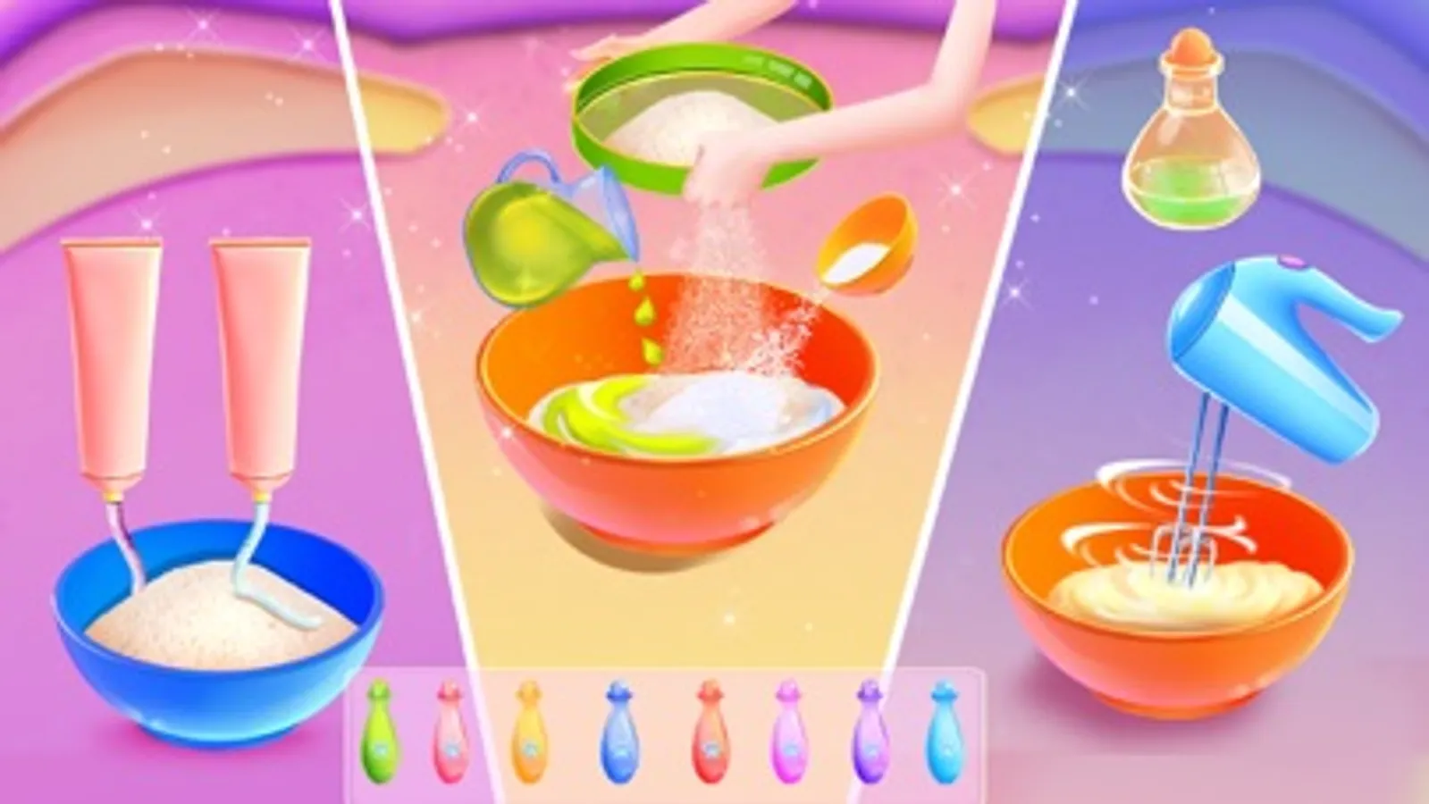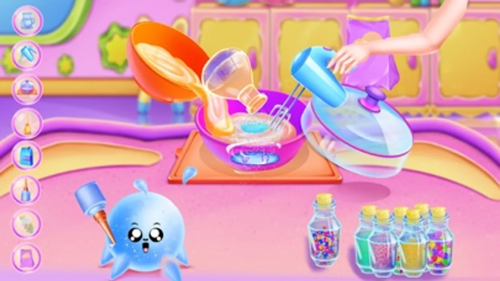 Explore the magical slime world, where there are different toys to choose from, like making slime little monsters, cars, rainbows, soft pottery windmills and more.You can experience different production materials, such as borax, paint, flour, olive oil, etc.We can click, knead, and make Slime into a part we need.You can also add your favorite bright powder and small decoration, but also change your favorite colors to different parts.The final made parts together form a slime piece.Play your creative ideas and make a magical Slime toy.