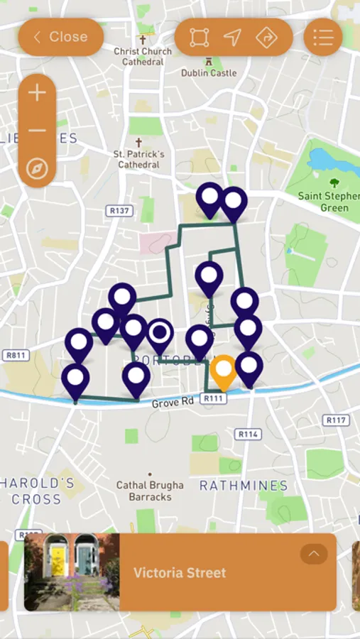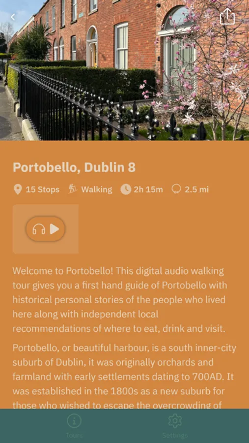 Walk Around The Neighbourhood is a self-directed mapped digital audio walking tour of Dublin 2 and 8 including Camden street and Portobello parish with interesting histories, stories and attractions. The walking tour takes about two and a half hours.