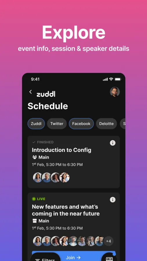 Zuddl makes it easy to attend exciting large-scale virtual events hosted anywhere in the world! Log in to see the upcoming events you've registered for, and join live events, from tech conferences to virtual festivals, with a single tap.