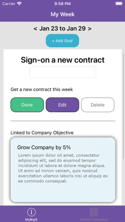 Enter 5 weekly goals that align with your company objectives, and you will be more engaged. Your company will have better profits because of better directional alignment of personal goals and company objectives. You are in charge of your performance reviews and they will be fact based and objective. Artificial intelligence will help you selecting the best weekly goals. AI will also create dashboards and reports, forecasting better profits and increased employee engagement.