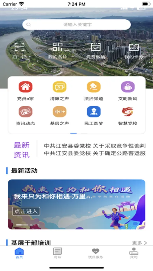 主要功能包括:用户登录、退出,三会一课通知,会议列表详情查询,组织生活会通知,会议列表详情查询,党费缴纳,三务公开,法治频道,文明新风,江安新闻,便民服务,基层之声,红云商城等
