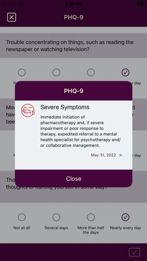 The PHQ-9 and GAD-7 are globally applied assessments for the monitoring of Depression and Anxiety symptoms. Depression Log allows you to monitor your depression and anxiety symptoms using the PHQ-9 and GAD-7 questionnaires.