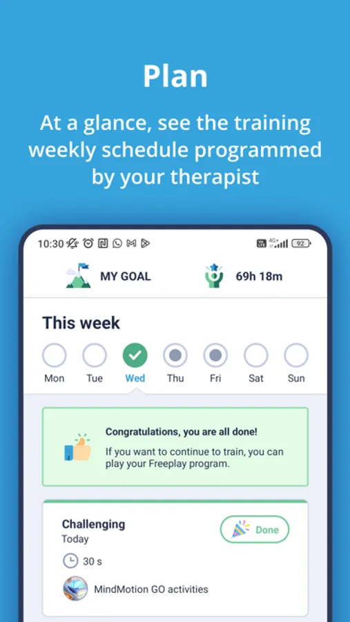 Patients can always see the therapeutic objective defined with their therapist to stay motivated to perform their therapy. They are also informed on the total training time they have completed with the MindMotion GO since the beginning of their therapy.