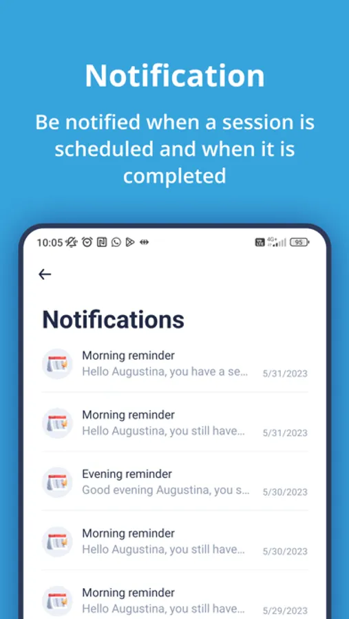 Patients get informed on the scheduled training sessions, as defined by their therapist on the MindMotion Companion platform. Patients receive reminders and have a simple view on the schedule for the day and for the upcoming sessions.
