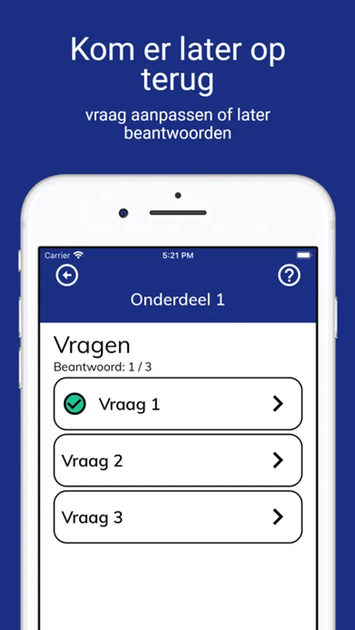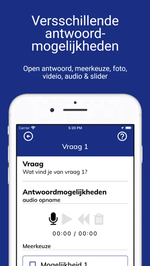 Deze vragen bestaan uit verschillende antwoordmogelijkheden waarmee u door middel van een open antwoord of spraakopname uw bevindingen kunt uiten.