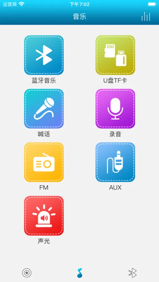 音乐:通过音响播放用户手机的音乐,也支持U盘,SD卡的音乐
