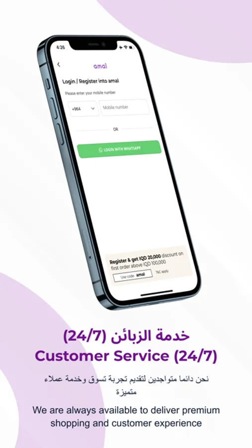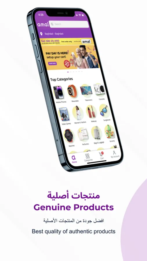 Download Amal ecommerce app to receive special in-app discounts such as 10% off (up to IQD 10000) on your first order and checkout with an easy and intuitive user experience.