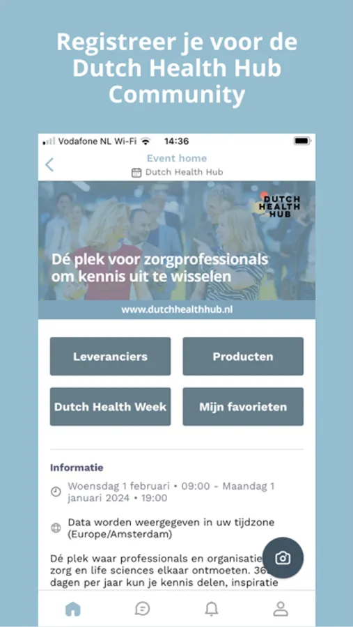 Registreer je voor de Dutch Health Hub Community waar je alle informatie vindt over Dutch Health Week, Zorg & ICT, Zorgtotaal, Support en andere evenementen. De Dutch Health Hub Community is dé plek waar professionals en organisaties uit zorg en life sciences elkaar ontmoeten. Met deze app kun je jouw eventbezoek voorbereiden en in contact komen met collega’s uit de branche. Daarnaast vind je hier ook je ticket voor het door jouw gekozen event.