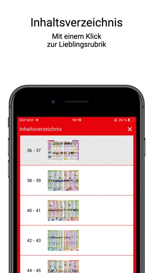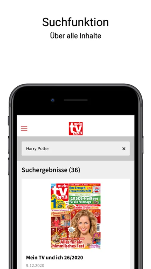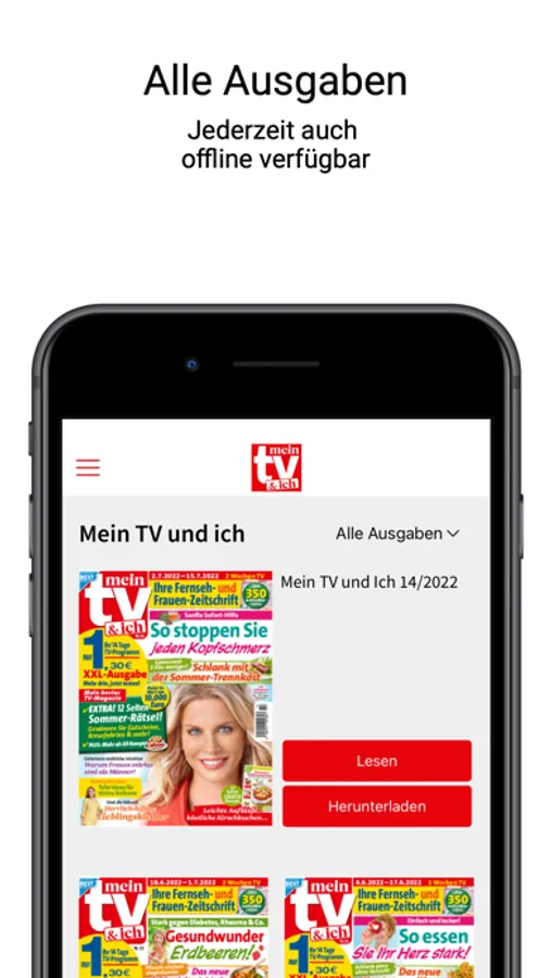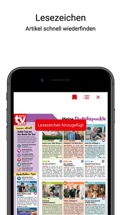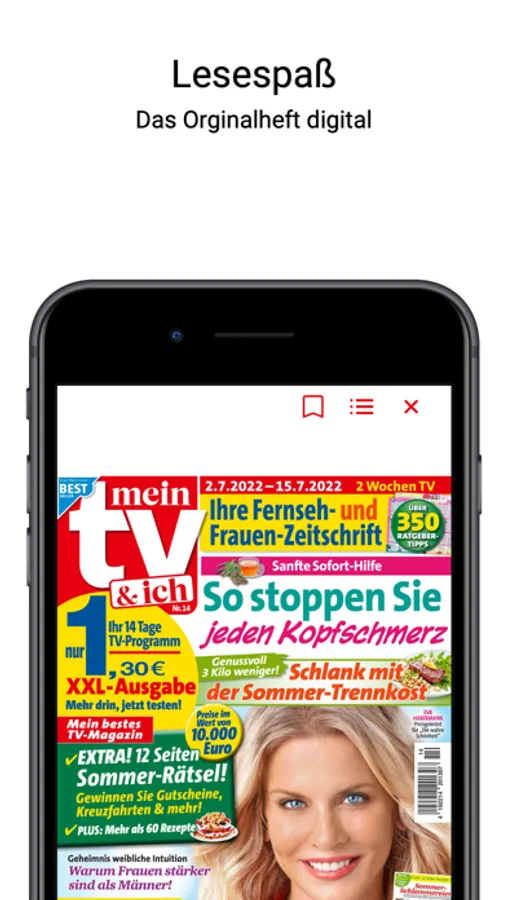 Sie möchten über die neusten Trends erfahren und gleichzeitig das aktuelle TV-Programm überall dabeihaben? Die mein TV&ich gibt es jetzt auch als ePaper! Sichern Sie sich ein digitales Abo und erhalten Sie so immer die neusten TV-Tipps und das Programm für die nächsten 14 Tage auf einem Blick. Mit der hilfreichen Suchfunktion und der Lesezeichenfunktion finden Sie schnell Ihre Lieblingsserie und können die Seite der Ausgabe direkt innerhalb der App speichern. Das Heft führt Sie auf 84 Seiten durch die neuesten Trends und enthält alle zwei Wochen die 22 besten TV-Tipps für Sie. So haben Sie auch unterwegs die beste Mischung aus Service und Beratung immer dabei. Gemacht von Frauen für Frauen!