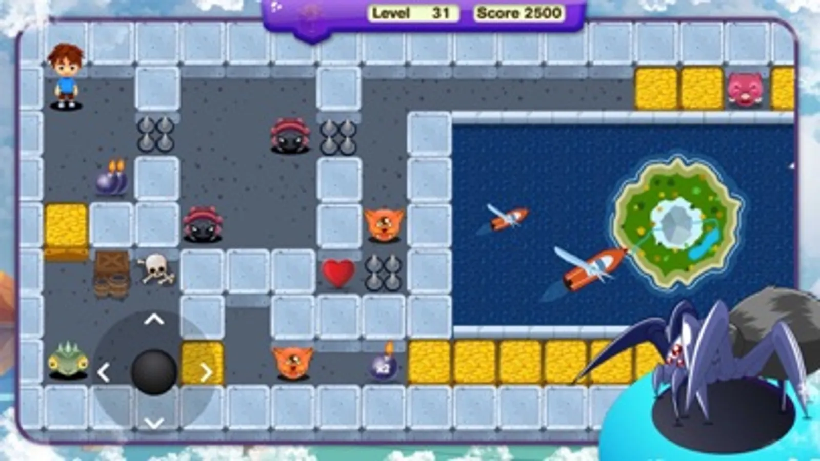 > Some power-ups like Bomb Range, Double Bomb, Shield, Speed, Lives, Key and Warrior bomber jacket are added throughout the game. Find them out and make your chances of getting a win more obvious.