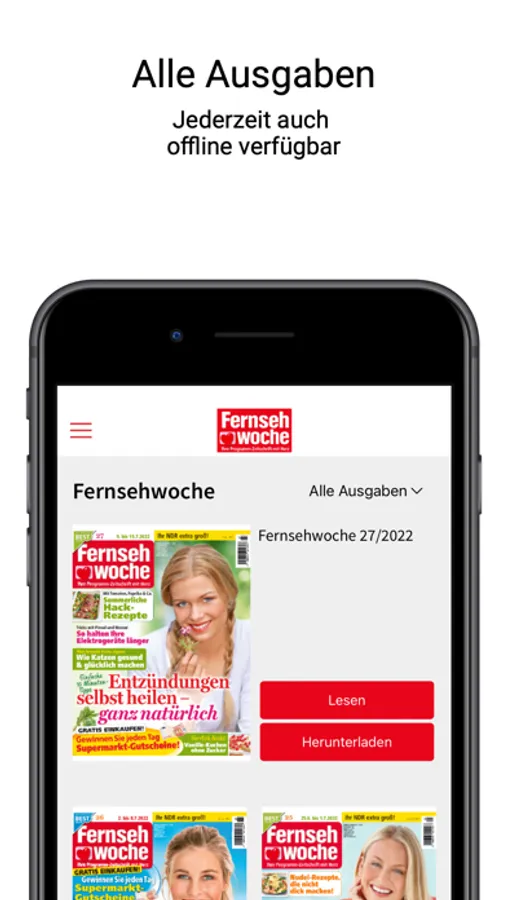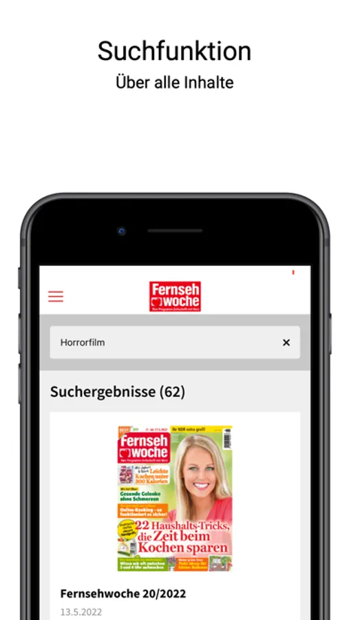 Ein hochwertiges Fernsehprogramm mit spannendem Ratgeberteil auch unterwegs dabeihaben? Das ist kein Problem: Mit der App der Fernsehwoche ist möglich, von überall auf Ihre Zeitschriften zuzugreifen. Ganz einfach mit dem digitalen Abo Ihre Zeitschrift auf dem Handy lesen und immer die aktuelle Ausgabe dabei haben. Die großartige Themenmischung bietet jede Woche neue, spannende News und Tipps. Neben exklusiven Interviews mit den Stars gibt es einen Überblick aller Highlights der Programmwoche und tägliche Filmtipps. Sichern Sie sich jetzt ein Abo und verpassen Sie keine Ausgabe mehr. Mit der praktischen Such- und Lesezeichen-Funktion ist die App der perfekte Begleiter für jeden Tag!