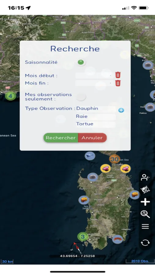 The search is intuitive with seasonality/dates and the possibility to select several types of observations.