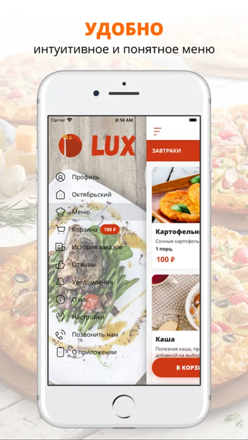 Приложение LUX — это удобный способ заказа еды домой или в офис! Мы готовим наши блюда из качественных свежих ингредиентов и доставляем еду по Октябрьскому быстро и бережно.