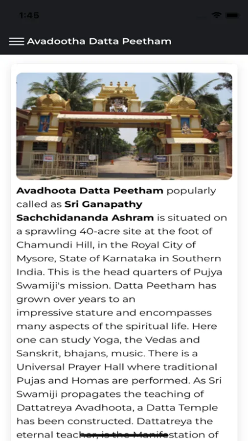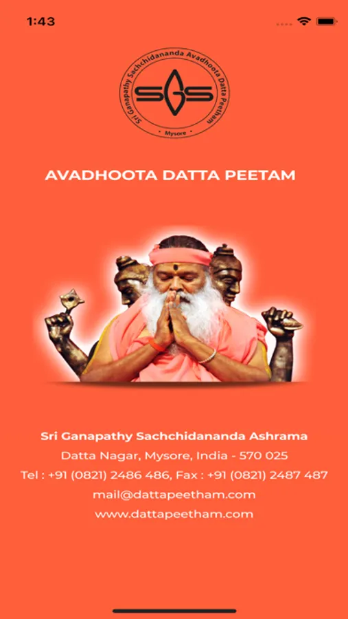 Avadhoota Datta Peetham popularly called as Sri Ganapathy Sachchidananda Ashram is situated on a sprawling 40-acre site at the foot of Chamundi Hill, in the Royal City of Mysore, State of Karnataka in Southern India. This is the head quarters of Pujya Swamiji's mission. Datta Peetham has grown over years to an impressive stature and encompasses many aspects of the spiritual life. Here one can study Yoga, the Vedas and Sanskrit, bhajans, music. There is a Universal Prayer Hall where traditional Pujas and Homas are performed. As Sri Swamiji propagates the teaching of Dattatreya Avadhoota, a Datta Temple has been constructed. Dattatreya the eternal teacher, is the Manifestation of the Triple Principle of Sat (Existence), Chit (Knowledge) and Ananda (Bliss).