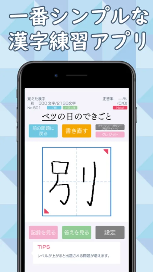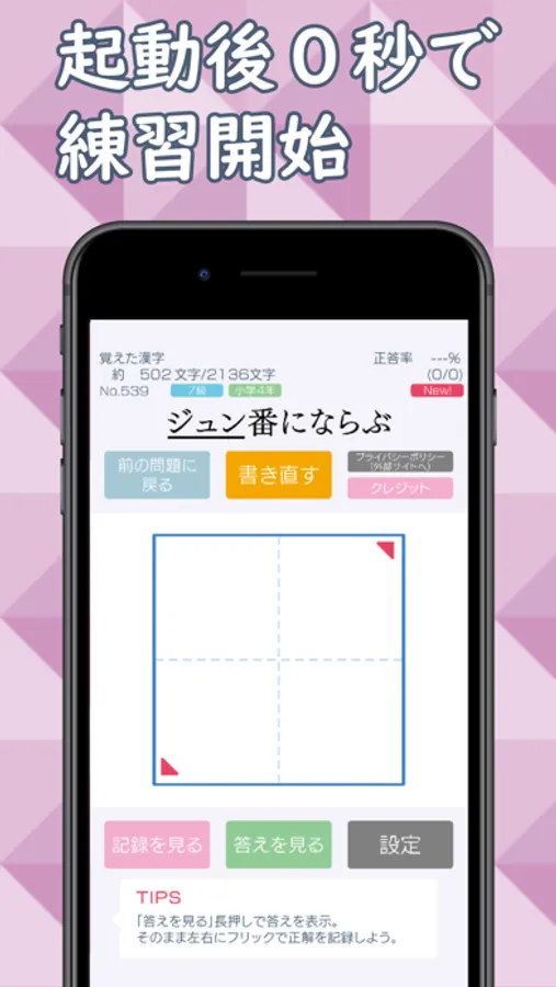・レベルの設定や画面の遷移など一切なしで起動後すぐに漢字の書き取り練習をはじめることができます