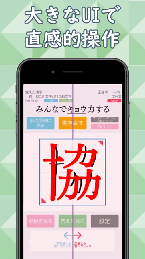 ・解答の確認と正解/不正解の記録は長押し+フリックのワンタッチで完了。気持ちよく漢字練習ができるように、直感的かつスピーディーな操作を追求しました。