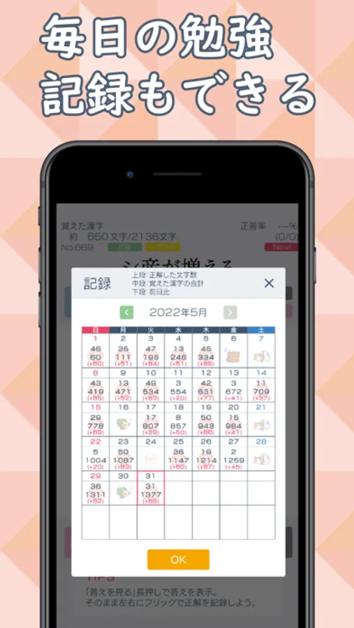 ・シンプルなカレンダー形式で漢字練習の記録を確認することもできます