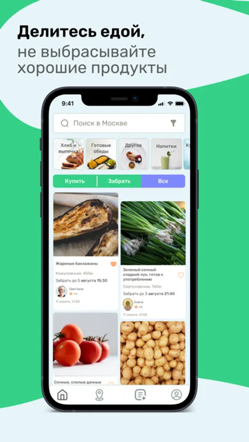 Сервис Еда Дома позволит вам найти нужные продукты поблизости или добавить предложение о тех продуктах, срок годности которых еще не истек, но которые по разным причинам стали не нужны.