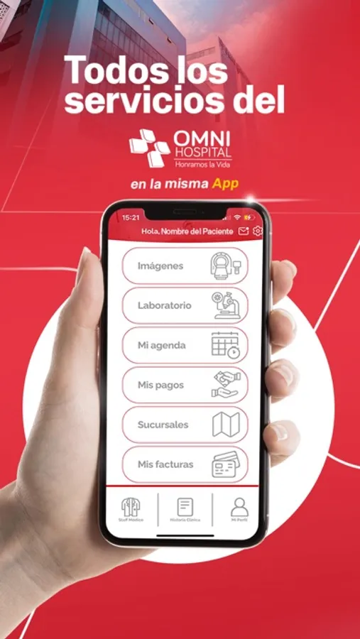 Puedes realizar agendamiento de consultas médicas, Laboratorio Clínico OmniLab, Imágenes, servicio de toma de muestra a domicilio, conocer nuestro Staff Médico, revisión de noticias y promociones activas del hospital.