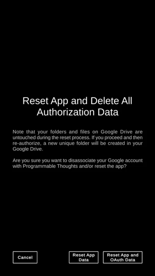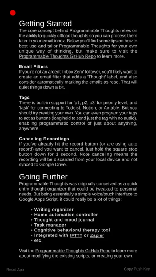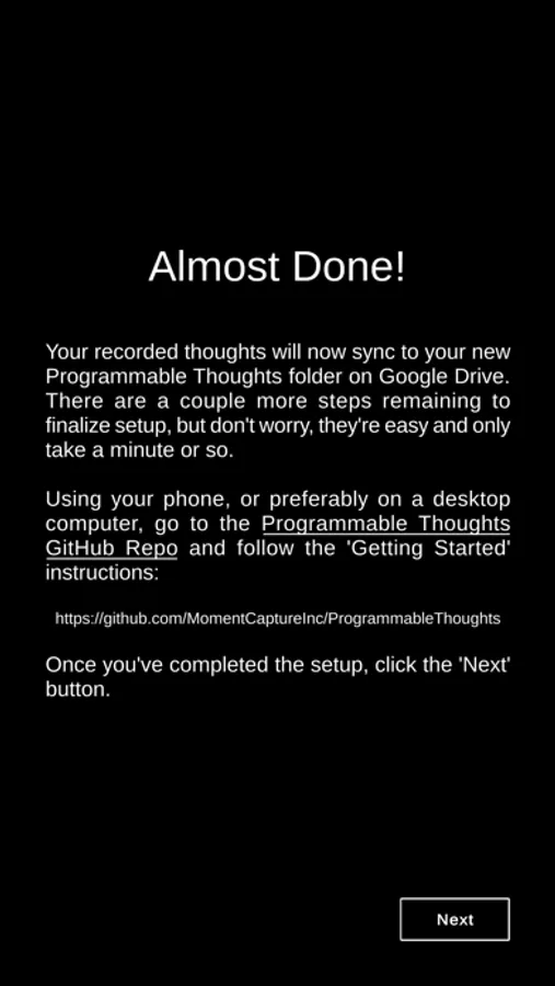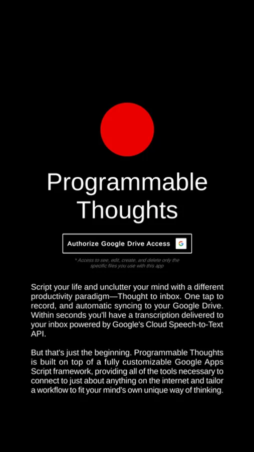 After installing the app and authorizing Google Drive access, you'll need to setup the backend Google Apps Script (ie. copy/paste). It's a simple 2-3 minute process that doesn't require any programming experience. You can find the full instructions on the Programmable Thoughts GitHub repo - https://github.com/MomentCaptureInc/ProgrammableThoughts