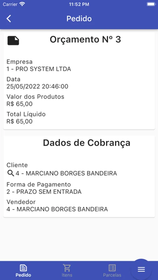Pedidos : Cadastrar os orçamentos dos clientes que serão efetivados em venda.
