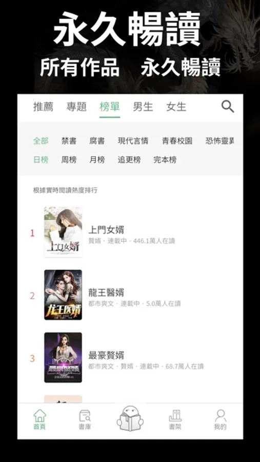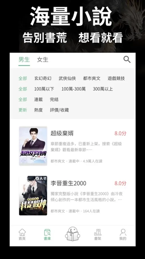 不可錯過的追書神器!海量熱門暢銷小說庫,類型豐富,內容覆蓋言情小說,穿越小說,霸道總裁、武俠仙俠、玄幻奇幻、軍事歷史、科幻未來、恐怖懸疑等...