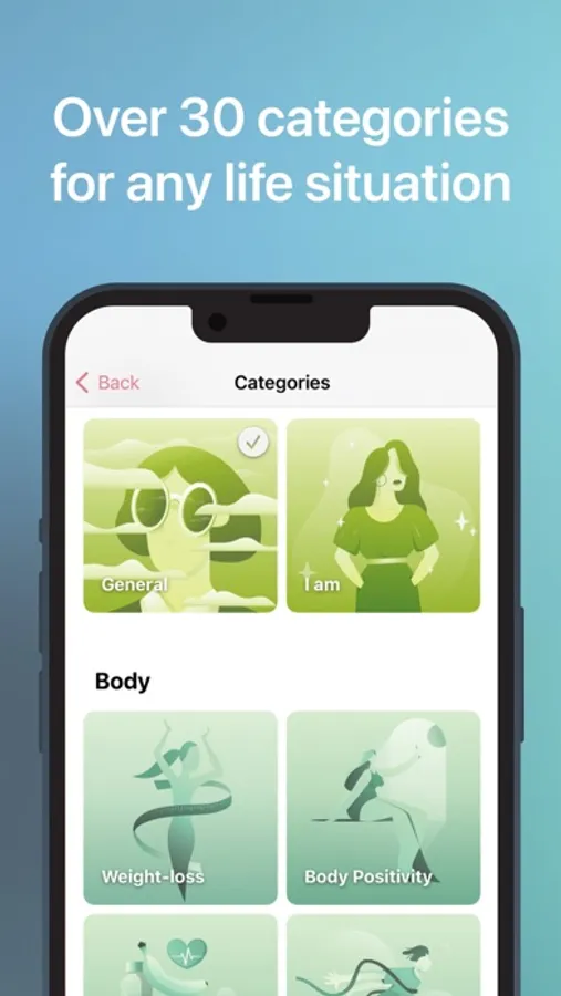 - Browse thousands of positive affirmations from categories covering various life situations.
