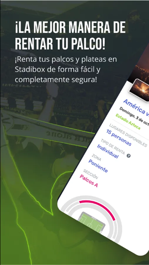 Stadibox ofrece una alternativa segura, cómoda y confiable para rentar palcos y plateas para tu evento favorito a través de una plataforma especializada. Stadibox revisa la autenticidad de las propiedades y protege a los dueños de las mismas por daños o pérdida de boletos mediante de un depósito de seguridad.