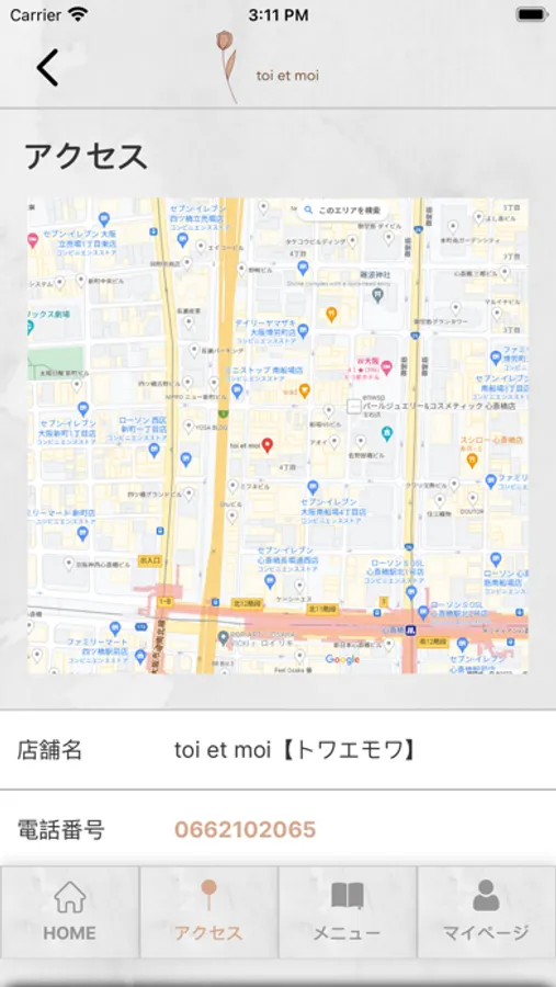 心斎橋駅北12番出口(クリスタ長堀)を出てすぐ右側にVIVIENNE WESTWOOD心斎橋店がございますのでその左横の道を北に真っ直ぐ進んで曲がり角を2つ越えた区画の右側にございます。