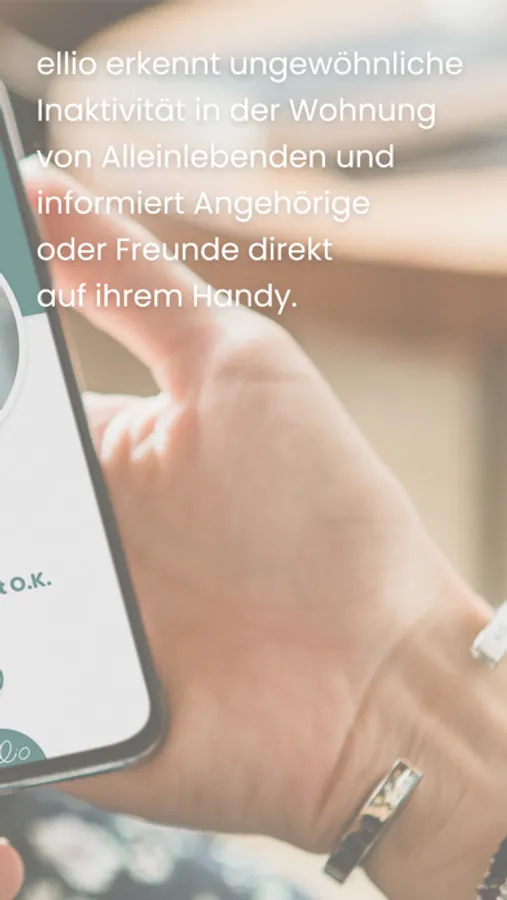 ellio besteht aus einer dezenten Basisstation, die in Ihrer Wohnung aufgestellt wird und einer en Familienapp für Ihre Angehörigen. Das Basisgerät ist mit Sensoren ausgestattet, die Veränderungen im Raum wahrnehmen können. Erkennt ellio in der Wohnung keine Aktivitäten, obwohl jemand zu Hause ist, sendet das Gerät einen Warnhinweis auf das Handy ausgewählter Personen.