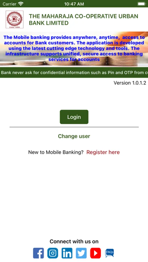 This official App of Maharaja Bank to access and transact of your bank account. You can view the account statements on the go at your convenience, even while at work or commuting. Checking the balance in your account, managing and scheduling utility bill payments, adding a top-up in your prepaid mobile phone or DTH account, paying Visa credit card bills, or instantly transferring money from one bank account to another through IMPS/NEFT is now possible at the click of just a few buttons on your phone.