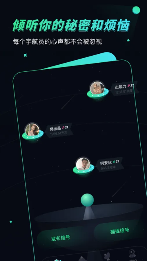 信号星球是一款通过散播信号和接收信号来帮助人们通过倾诉来消解烦恼的有温度的平台。