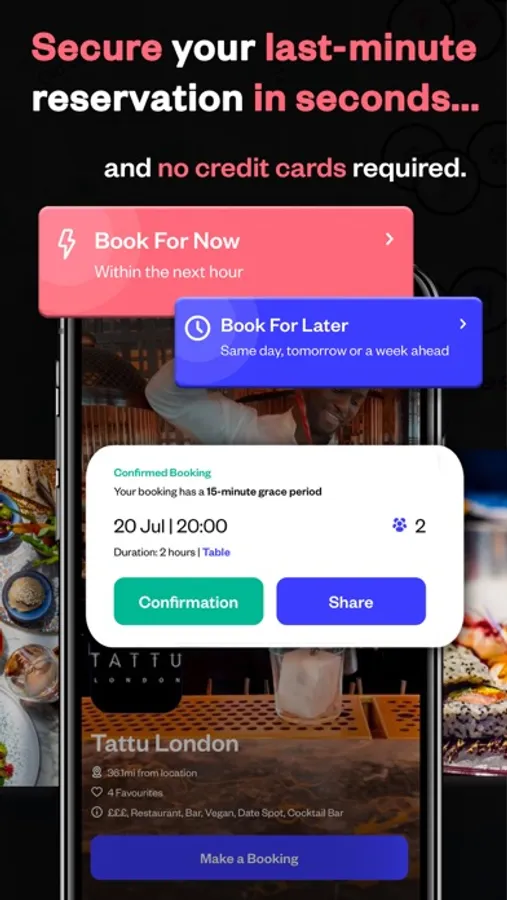 - Spontaneous plans? Find last-minute table reservations within the next 60 minutes at your favourite restaurants and bars.