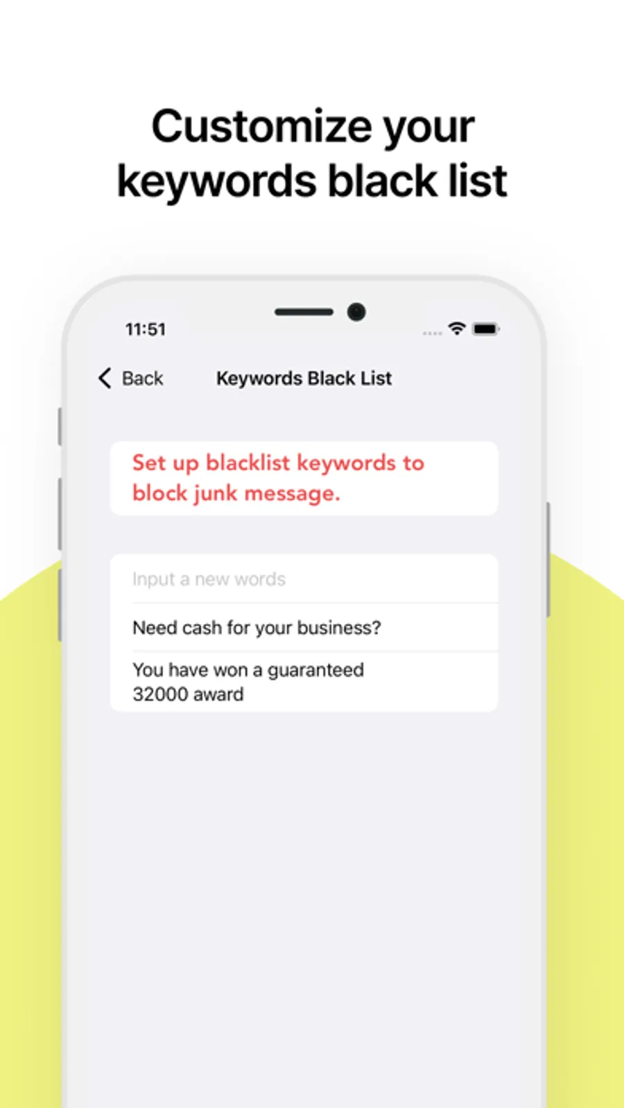 * Block text messages by keywords in message content.