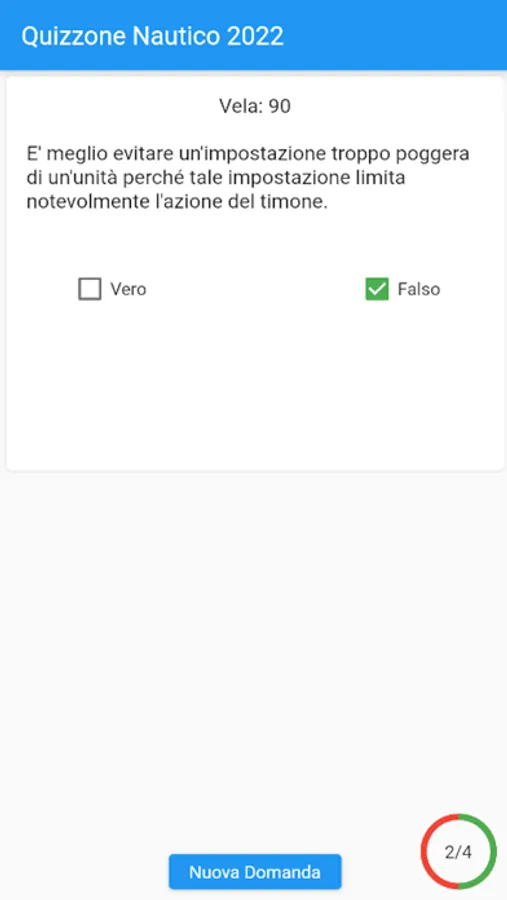 Allenati e preparati per conseguire la patente Nautica oltre 12 miglia vela e motore. Tutti i quesiti di teoria contenuti nel DD 25 Gennaio 2005. In basso a destra un utile indicatore ti indica il grado di preparazione, mostrandoti le domande risposte correttamente sul totale. Vengono calcolate solo le ultime 100 domande.