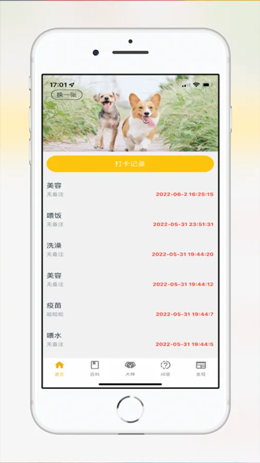 每日遛狗、喂饭、喂水一键打卡,快速记录。