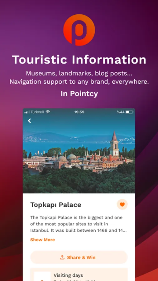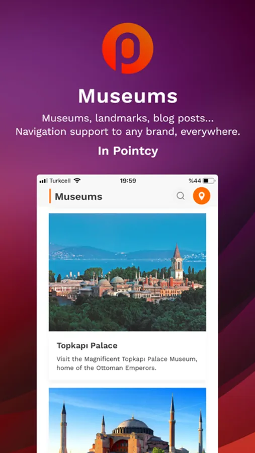 Touristic information: You will be able to access touristic information with Pointcy when you visit touristic spots in Turkey whose civilization dates to 12.000 years ago. You will be able to easily access information about museums, archaeological sites, landmarks, and objects. You will be able to learn touristic and cultural values easily without professional support and reach satisfactory content. Pointcy will be your virtual guide who will recommend you the must-visit points to increase your travel experience. You will be able to purchase the mobile MuseumPass advantageously to visit the museum and archaeological site. Necessary phone calls and complaints authorities will be at your fingertips.