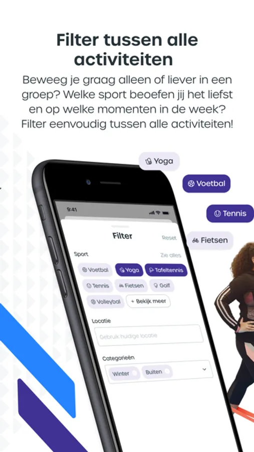 Om het zoeken van jouw volgende activiteit zo makkelijk mogelijk te maken, kun je zoeken op verschillende sport en beweeg categorieën en filteren tussen alle activiteiten.