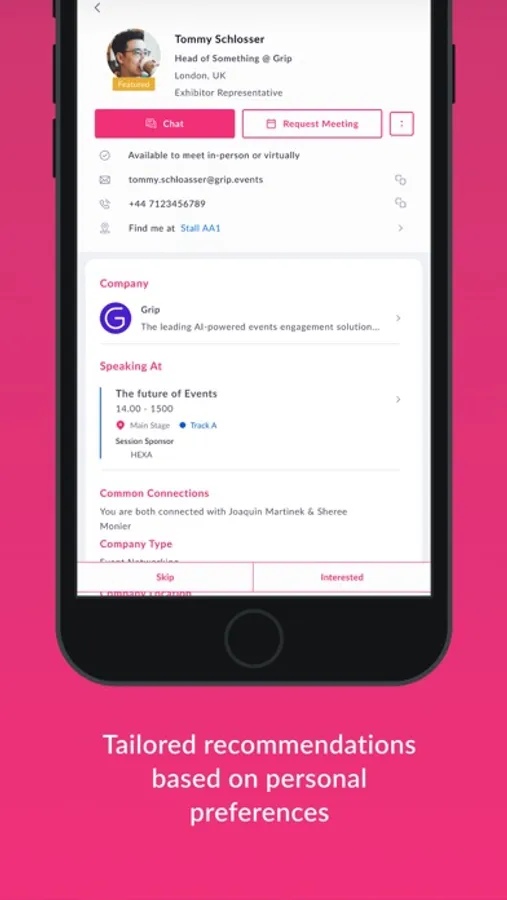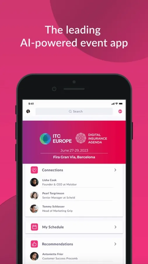 Your personalised app for ITC DIA Europe events. Connect and be inspired with high-level AI-based matchmaking! Welcome to the official ITC DIA Europe event app. Our mission is to connect insurtechs with insurers in order to accelerate growth and innovation in the insurance industry. We do this via two annual in-person events: Barcelona and Munich. DIA has been active since 2016 and ITC DIA Europe Barcelona 2023 will be the first event since our team-up with leading insurtech event organiser ITC known for their events in Las Vegas, Singapore and Miami. This event app will be your trusty companion during an ITC DIA Europe event. Everything you do on this app will be carried over between events. This means you don't have to fill in your details again after your first visit! The main features of the GRIP-based networking app are: